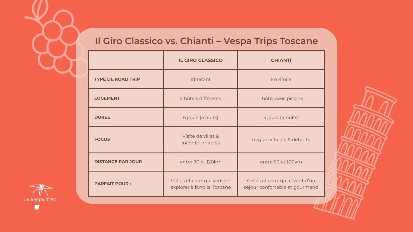 Comparez nos deux voyages en Vespa en Toscane en un coup d’œil. Ce visuel met en avant les principales différences entre Il Giro Classico et Chianti, pour vous aider à choisir l’itinéraire qui correspond le mieux à votre style, vos envies et votre rythme.